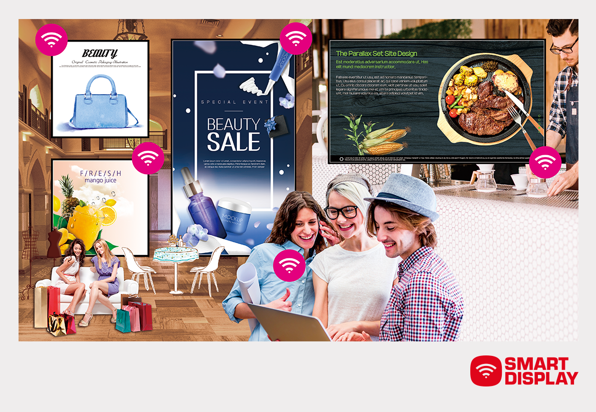 [SMART DISPLAY] 기업 등의 마케팅, 광고, 트레이닝 효과 및 고객 경험을 유도할 수 있는 커뮤니케이션 tool로 대형 유통 업체, 매장, 마트, 호텔, 병원 등 다양한 장소에 Device를 이용한 정보 및 광고 매체로서, 원하는 정보를 원하는 시간에 송출 할 수 있는 솔루션, 디지털 영상 장치를 포함한 최첨단 Total System 입니다.