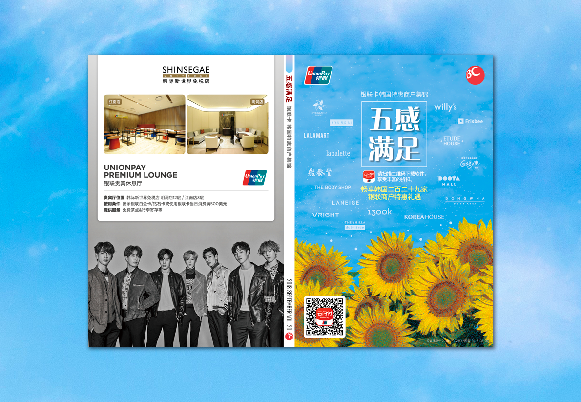 중국관광객을 위한 [필수 쇼핑가이드북] 중국 현지와 국내에서 동시 발행되며 쇼핑, 관광, 스타일, 한류스타 등 다양한 읽을거리와 270여개 가맹점 정보를 수록한 가이드북입니다. 발행부수: 300,000부 [한국 15,000부, 중국 15,000부] 발행주기: 계간지 [3월, 6월, 9월, 12월] 언어구성: 중국어(간체) 분량: 총 240페이지 판형: 145x210mm