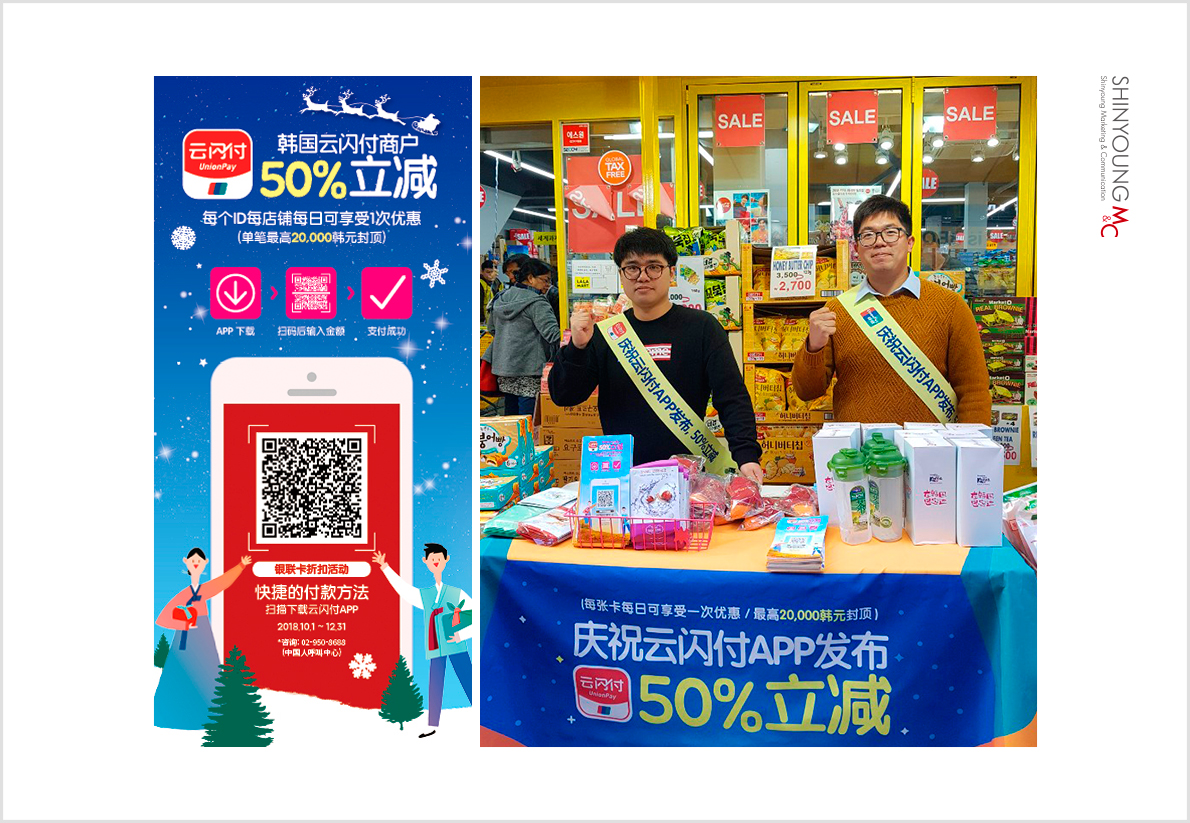 QR 행사 진행중 [겨울 QR 행사 PROMOTION 진행] 한국을 방문한 중국인여행객에게 BC카드에서 제작된 yunshanfu 어플을 사용하여 원활한 결제 및 다양한 할인혜택을 받을 수 있도록 명동일대에서 프로모션을 행사장을 설치하여 진행하였습니다. 이는 비단 행사 뿐만 아니라 지역 상권화 매출을 유도하여 경기 활성화를 위한 일원입니다.